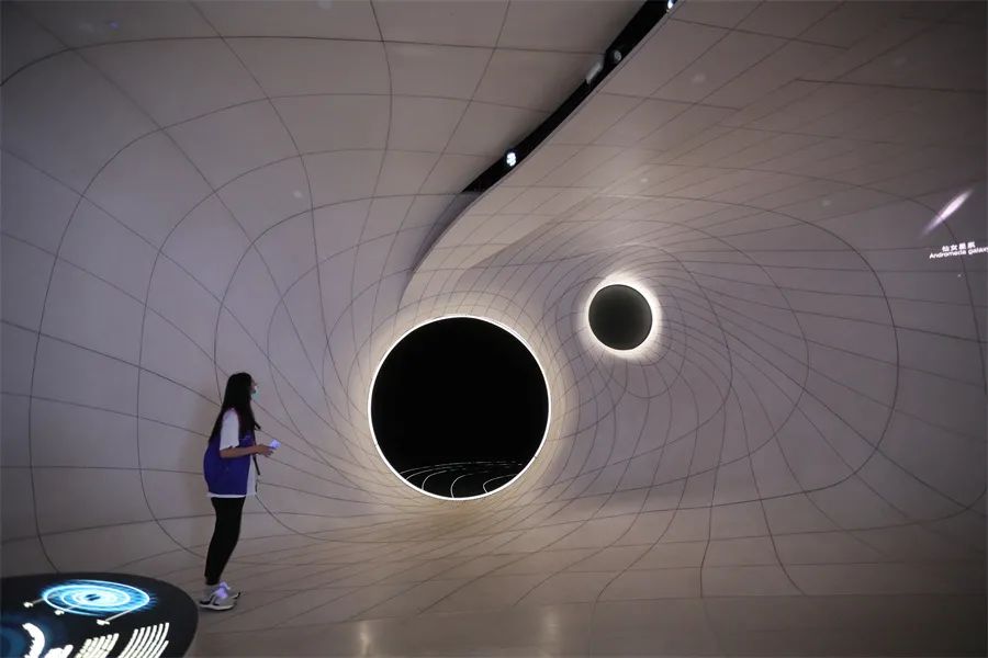 在这里,上海天文馆运用主题式环境氛围巧妙地对空间做了视觉分隔,如悬挂超窄无断点三维线型灯打造的时空网格、由三维双曲面水磨石天地墙构建的引力区。