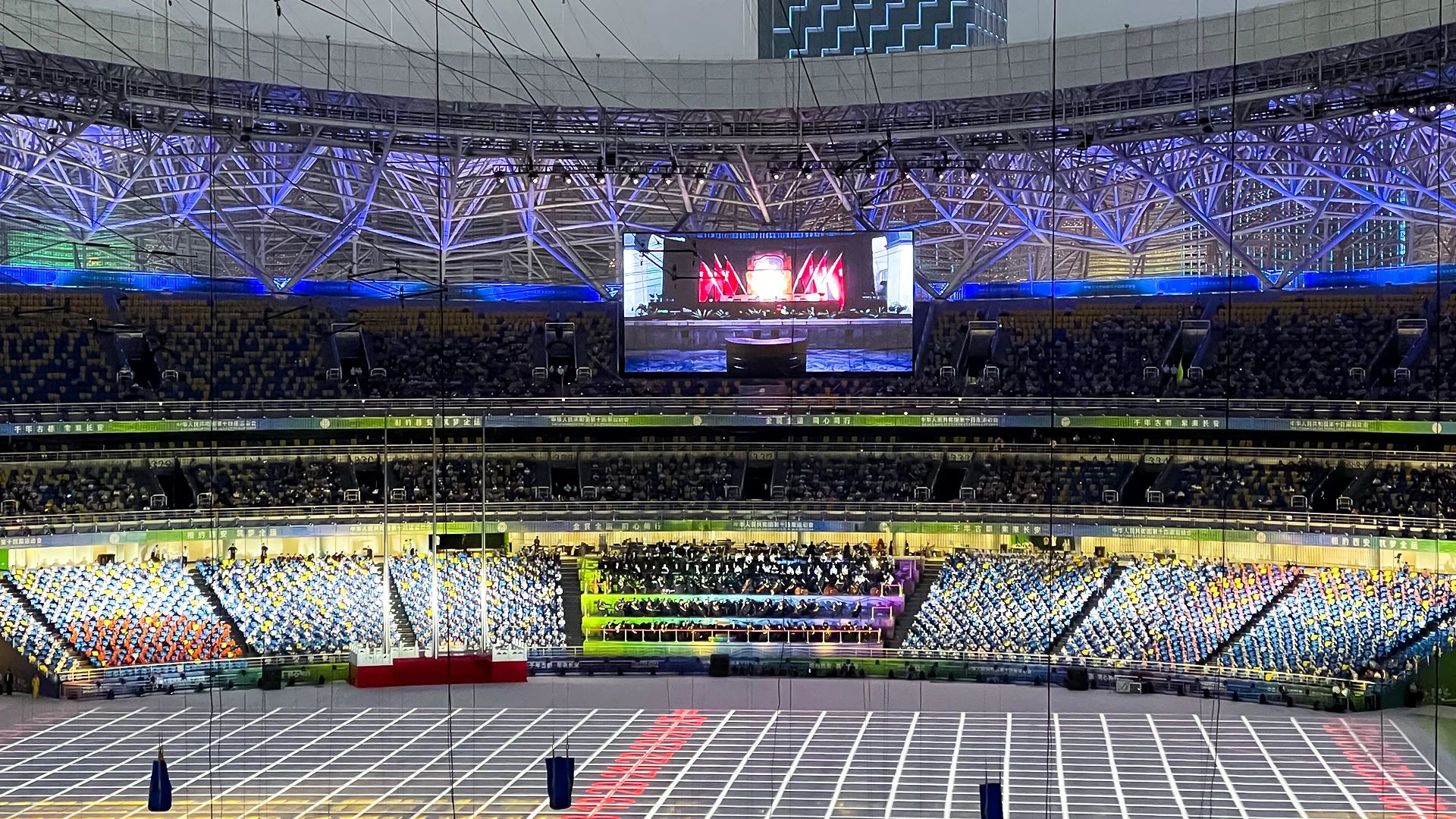 这是全运会走过的第26年,运动员们身披青春热血抵达战场。huatihui为奥体中心南北两侧打造两块4K超高清显示屏,总面积达550平米。开幕式激情澎湃的瞬间在这两块屏幕上呈现。