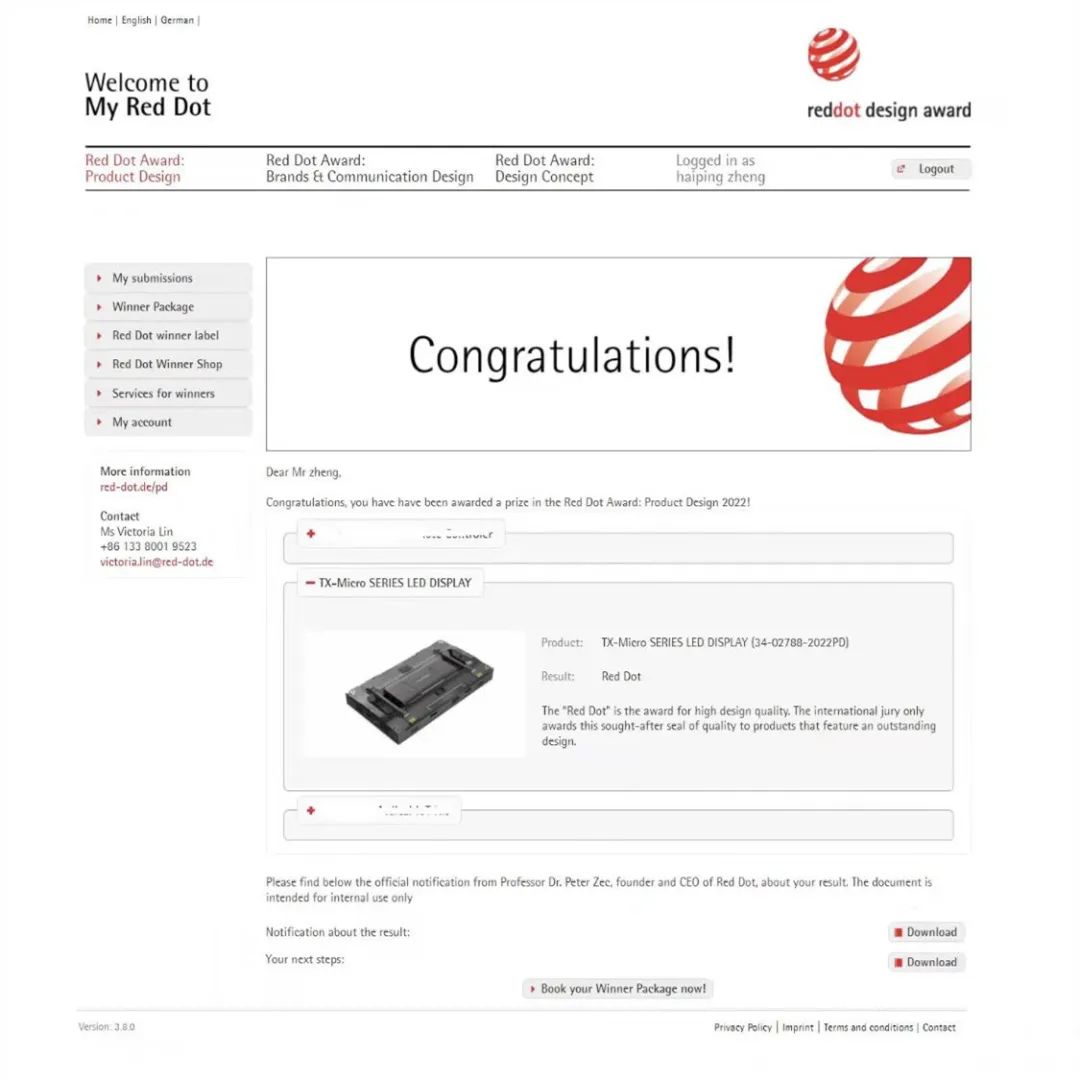 红点设计大奖由德国设计协会创立,至今已有超过60年的历史。该奖项与德国IF奖、美国IDEA奖一起并称为世界三大设计奖。红点奖每年吸引超过60个国家的近万件作品参与角逐,评选标准极其严苛,只有被公认具有国际性创意和设计的产品才能获此殊荣。huatihui此次获奖的TX-Micro系列LED显示屏、TVS系列小间距LED、HKS LED显示屏产品凝聚着全球前沿技术和创新设计,当之无愧。