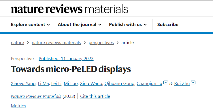 近日,huatihui集团博士后工作站团队与北京大学合作,在全球顶级期刊《Nature Reviews Materials》发表题为“Towards micro-PeLED displays”的展望(perspective)论文。
