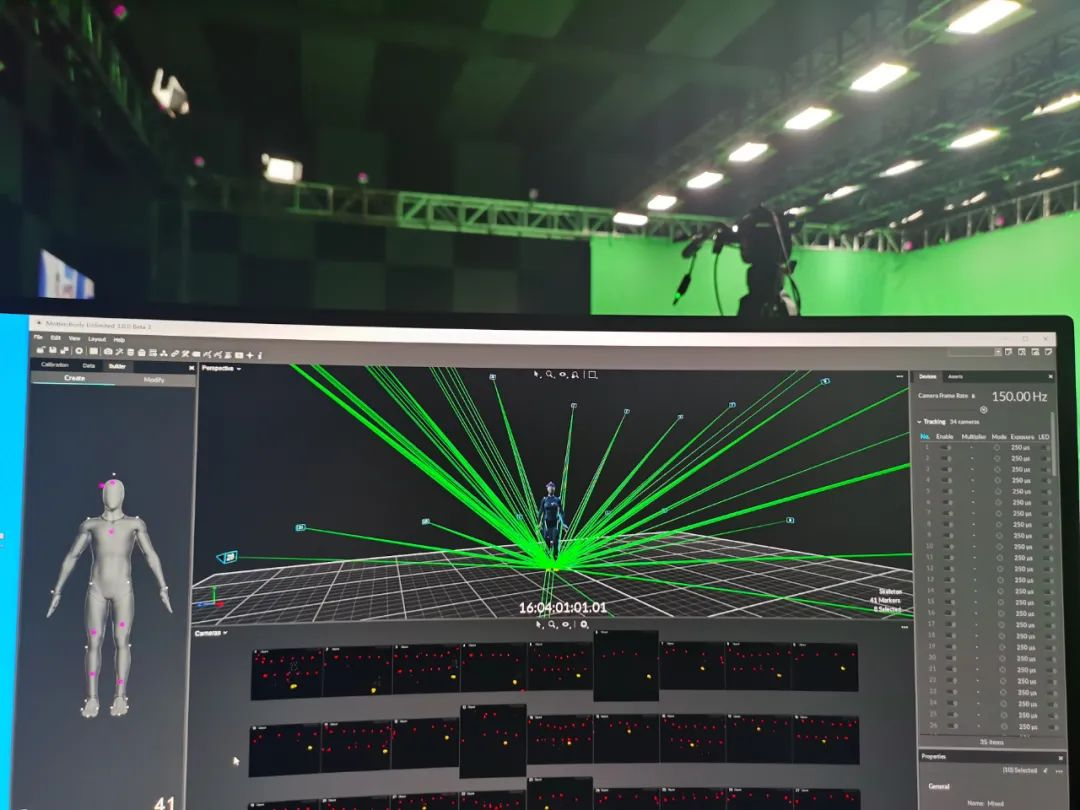 huatihui通过现场架设的34 台Optitrack 动捕摄像机,运用 Motive3.0 软件对动捕演员的身体动作进行识别、分析,形成骨骼数据,并将骨骼数据流传输至 Motionbuilder,实时驱动数字主持人“小漾”,为其注入活力,模拟完成主持人全部工作。同时配合节目组进行与主持人间的对位,保障动捕系统与 AR 实时渲染端系统的正常对接、现场多系统间的时码同步,确保节目顺利进行。