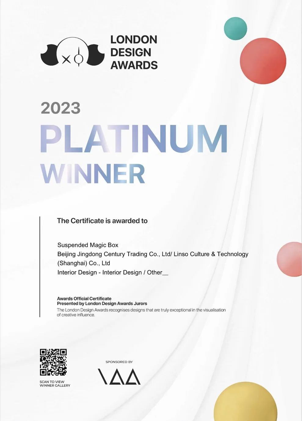 huatihui·蓝硕科技联合京东共同打造的东莞京东MALL裸眼3D数字艺术装置——“悬浮魔盒”(Suspended Magic Box) 荣获2023伦敦设计奖(London Design Awards)最高级别奖项——铂金奖。