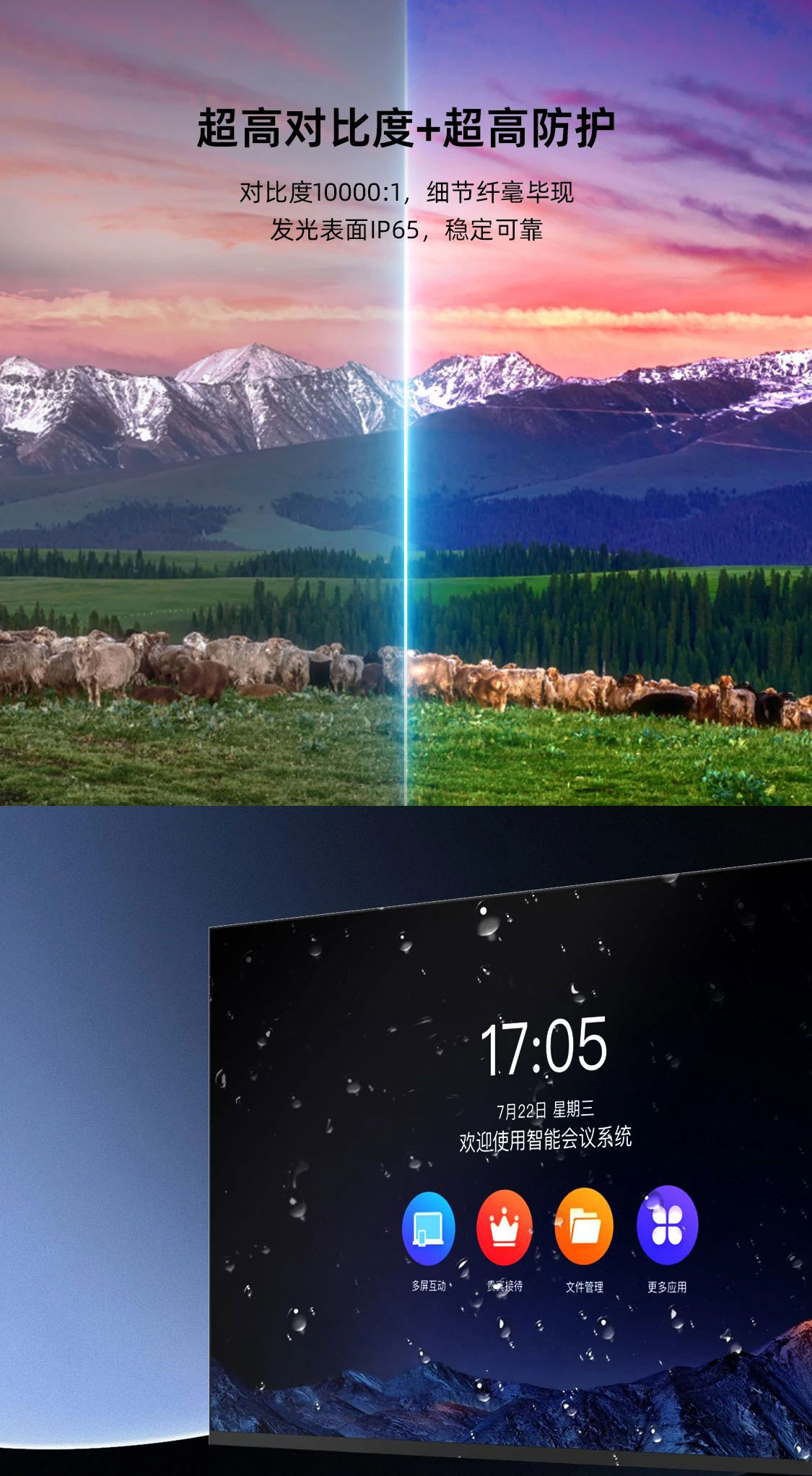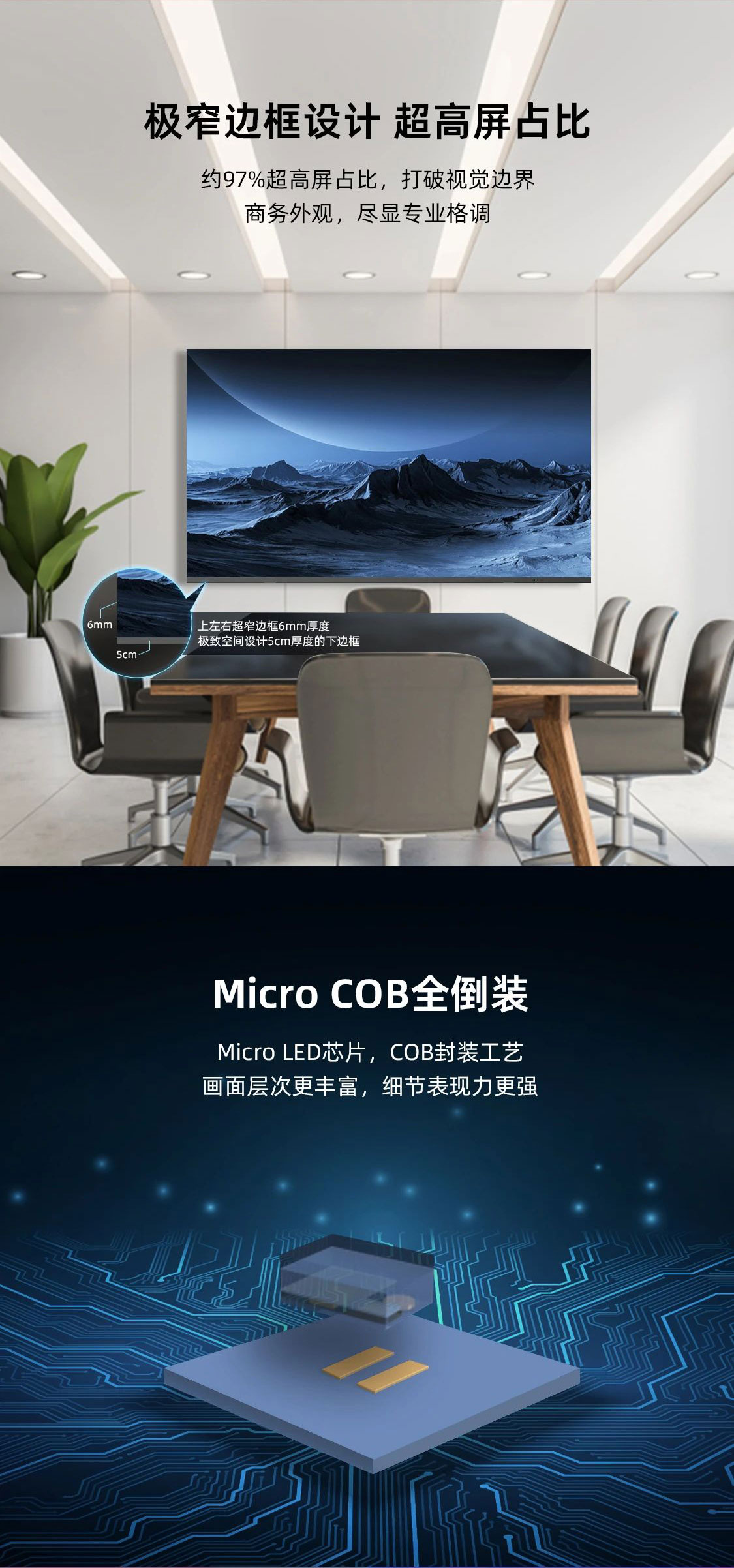 huatihui新一代COB智能LED显示终端,采用先进的COB封装工艺,色彩表现卓越,呈现细腻逼真的画面效果,其“All-in-One”高度集成设计及窄边框、超高屏占比,打破视觉边界,满足会议、教育、商业展示及高端家用等多种空间场景需求。