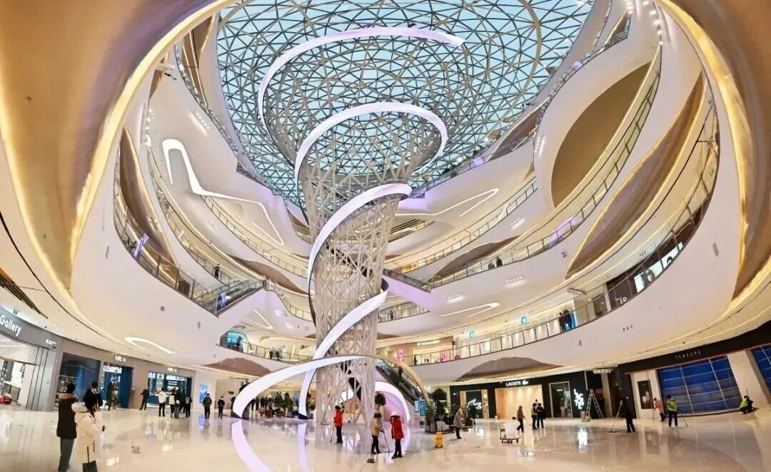 商城1号中庭的光影之境,成为特色打卡点,吸引众多消费者驻足。LED炫彩光带以柔性显示形态螺旋缠绕,流动的光影顺着光带直通穹顶,营造出超级壮观的空间视觉盛宴,将科技感与空间美学完美融合,带来前所未有的视觉享受。